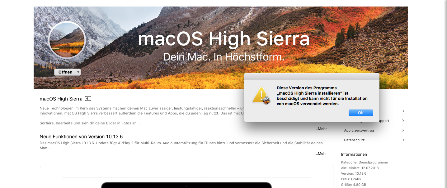 Es ist nicht möglich HIGH SIERRA vom Appstore runterzuladen, da diese beschädigt ist. Ich brauche jedoch dringend das Update! Gibt es noch einen anderen Weg High Sierra downzuloaden?