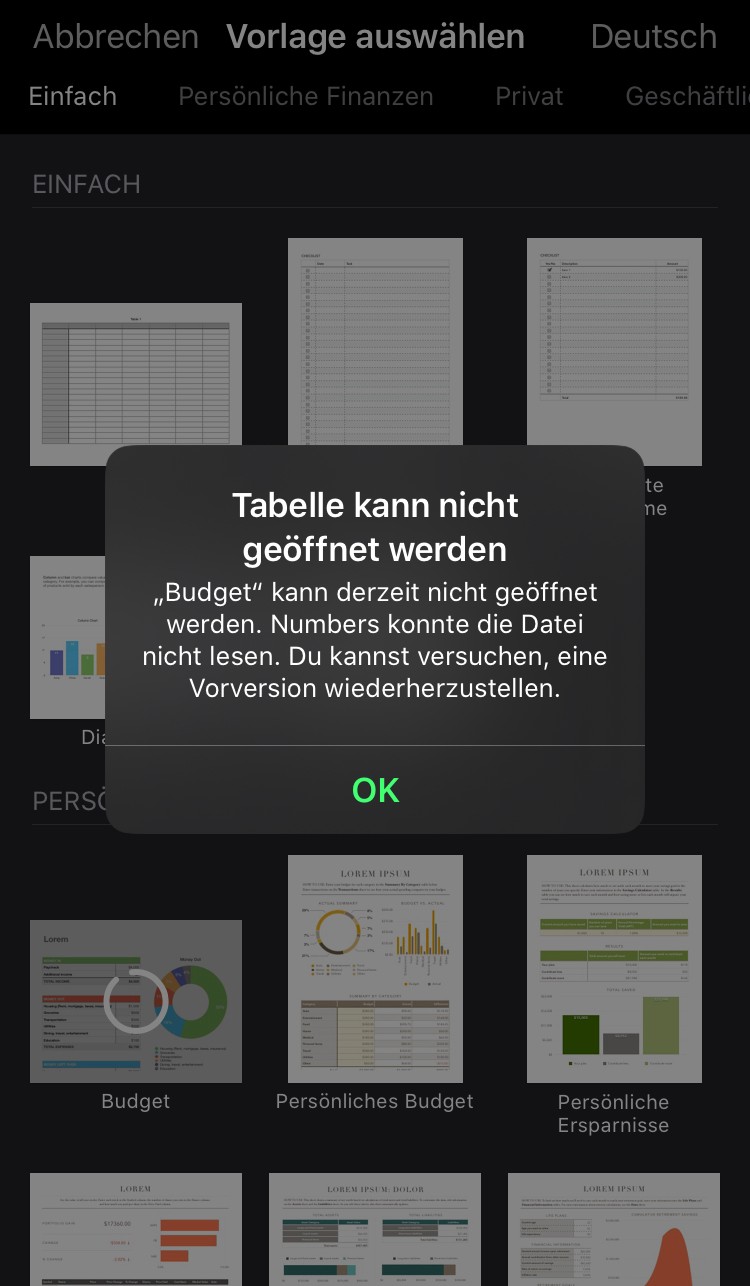Wenn ich eine Vorlage öffnen möchte (egal welche) am iPhone kommt diese Meldung "Tabelle kann nicht geöffnet werden - Budget kann derzeit nicht geöffnet werden. Numbers konnte die Datei nicht lesen. Du kannst versuchen, eine Vorversion wiederherzustellen".