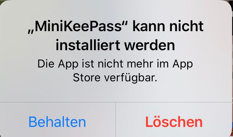 Die MiniKeePass App wurde aus dem AppStore entfernt und ich habe daher leider keinen Zugriff auf die App und vor allem nicht auf die gespeicherten Daten. Mein letztes Backup wurde heute morgen gemacht.