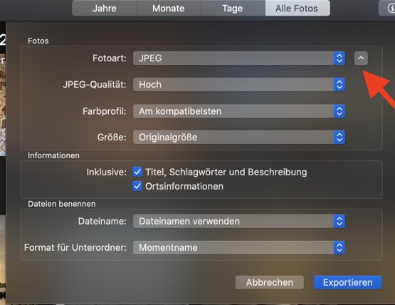 Dabei habe ich die original Fotos vom iPad importiert (hierbei sind alle Metadaten mitgekommen) anschließend habe ich über "Ablage >> Unbearbeitete Originale exportieren" versucht die Fotos dorthin zu bewegen...