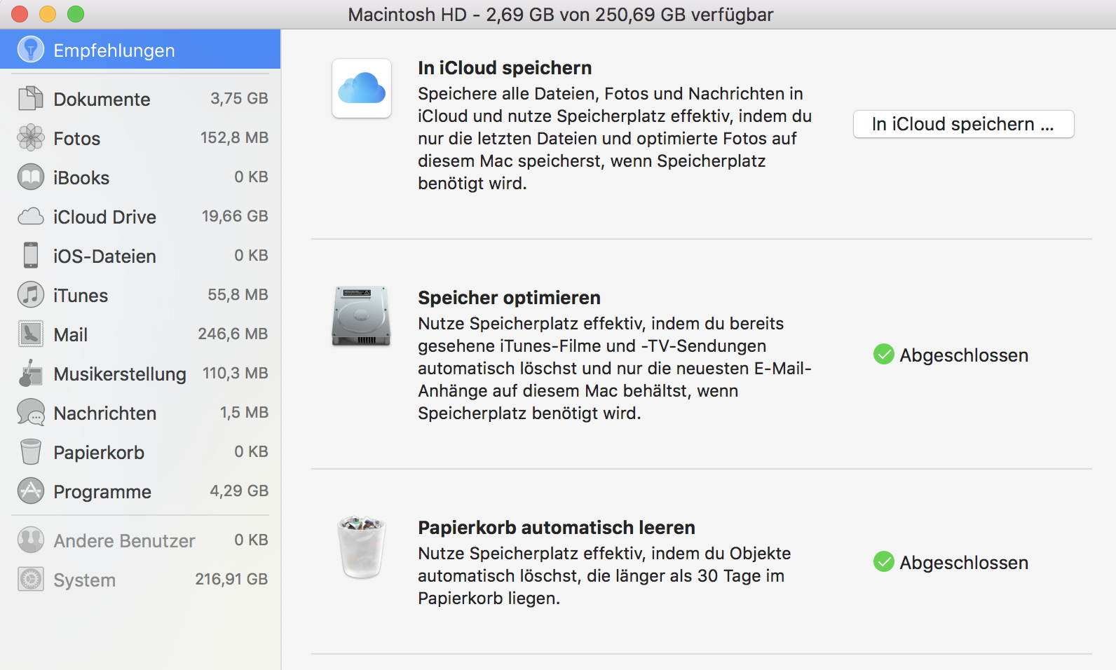 Irgendetwas hat sich kräftig bei meinem Macbook Pro verhakt. Von den 250 GB SSD sind 160 GB icloud-Daten, die eigentlich Speicheroptimiert abgelegt sein sollten. Ständig kommt trotzdem die Meldung "Festplatte fast voll". Also habe ich einige große Programme gelöscht (Garageband, iMovie), Cache bereinigt, Duplikate etc. Ein paar Minuten hält der freie Speicher an und läuft dann wieder voll. Dann habe ich ein großes Foto-Archiv auf externe Platte verschoben und gelöscht. 140 GB. Neustart etc. Ergebnis: "Festplatte fast voll". Catalina kann ich dadurch auch nicht installieren, falls hier die Speicherverwaltung besser gelöst sein sollte. Im Festplattenprogramm zeigt er dafür an, dass alles was ich lösche einfach dem System zugeschlagen wird. Bin als versierter Anwender ratlos...habt Ihr Ideen?