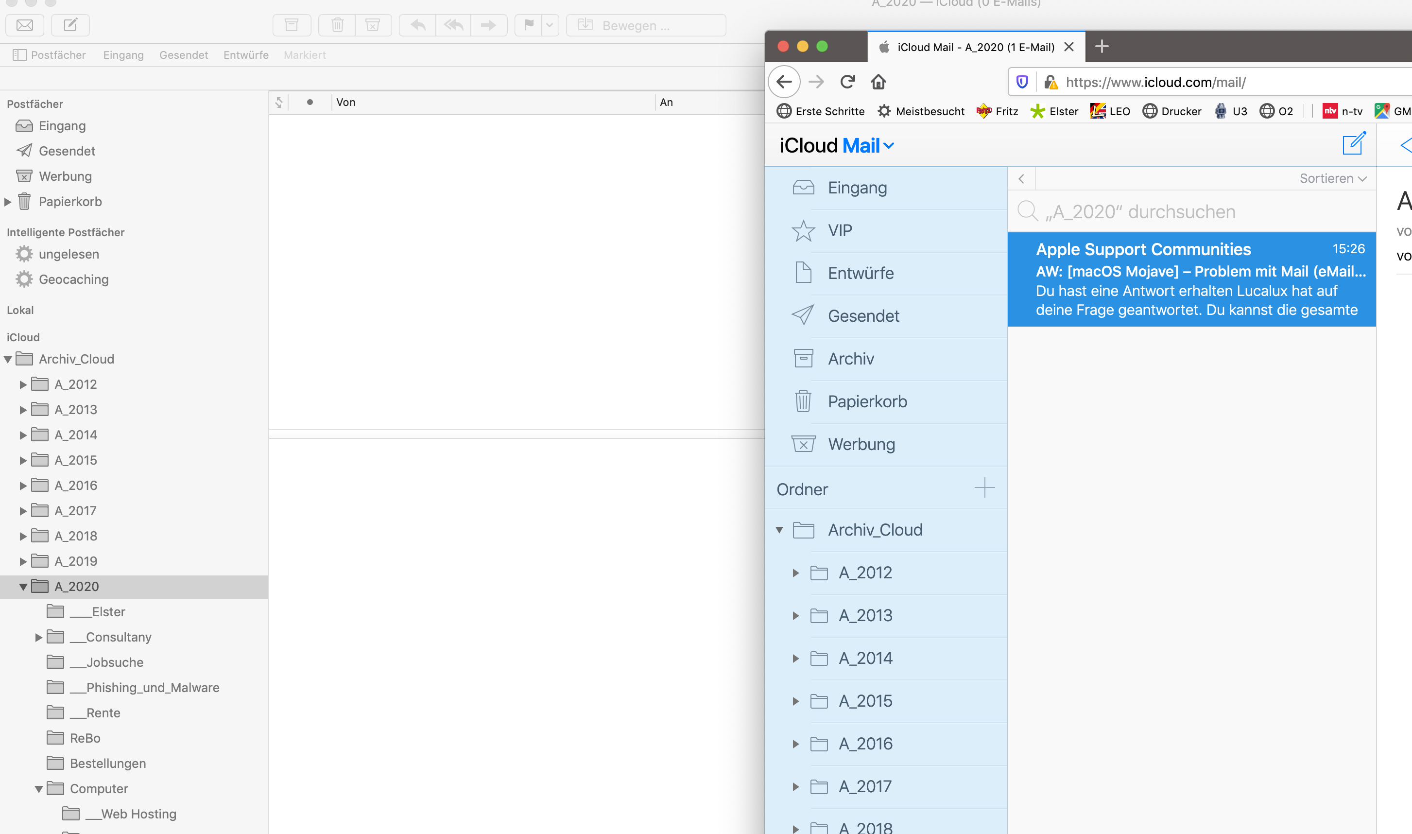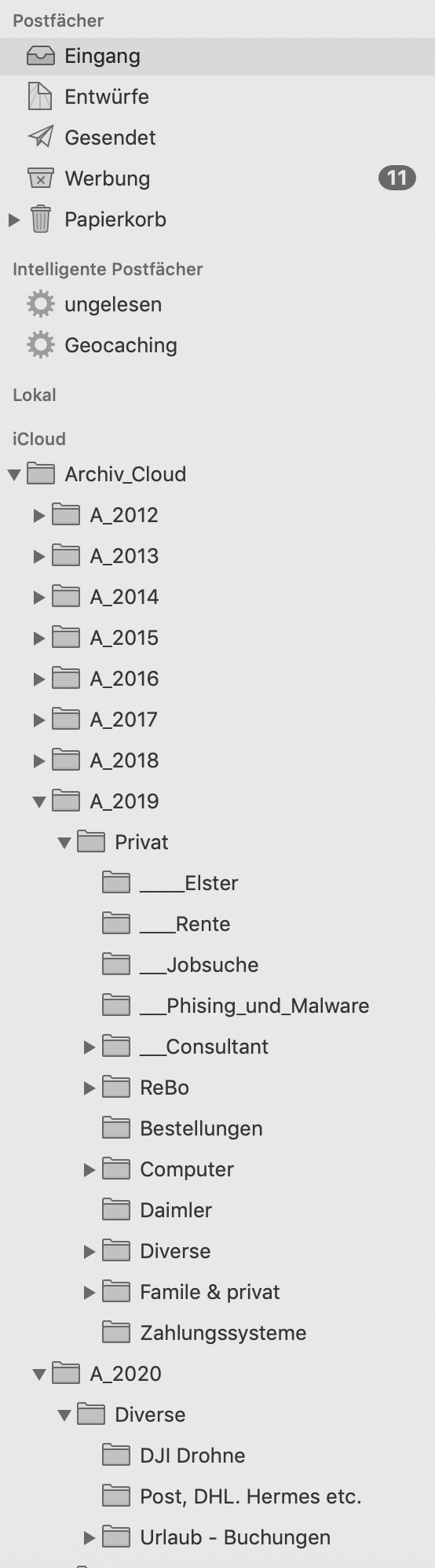 - Mein komplettes Archiv in der iCloud mit Mail "doppelt" gesichert (einmal über den Finder aus der Library und einmal aus Mail im mbox-Format exportiert.