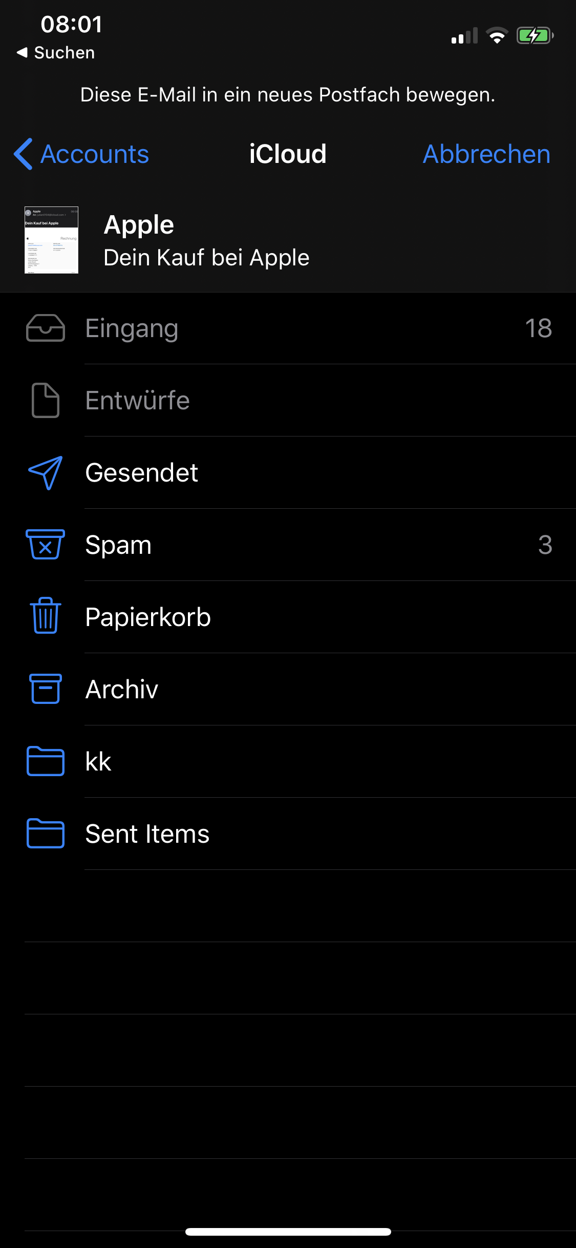 Am Sonntag Nachmittag hatte ich die Nase voll und habe beim Apple Support angerufen. Ich war sehr positiv angetan: Keine zwei Minuten Wartezeit und ein sehr kompetenter Gesprächspartner. Nach eine guten Stunde Telefonat kamen wir zu dem Punkt, an dem Mail sich wieder komplett mit der iCloud synchronisieren muss. Da das (trotz DSL mit 100 MBit/s) bei meiner Menge an Mails gut 5 Stunden dauert, vertagten wir uns auf den nächsten Tag, sollte die letzte Aktion nicht erfolgreich gewesen sein.