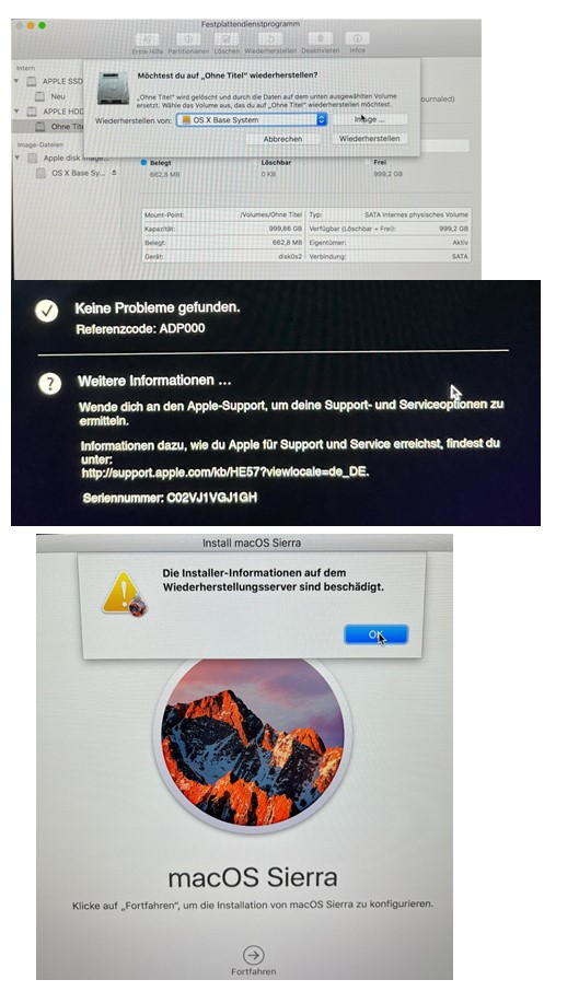 Ich versuche seit Tagen Sierra über die Mac Wiederherstellung auf meinen MacBook zu installieren. Leider sagt er mir jedes mal: "Die Installer-Informationen auf dem Wiederherstellungsserver sind beschädigt" Hat jemand eine Ahnung wie es sich beheben lässt ?
