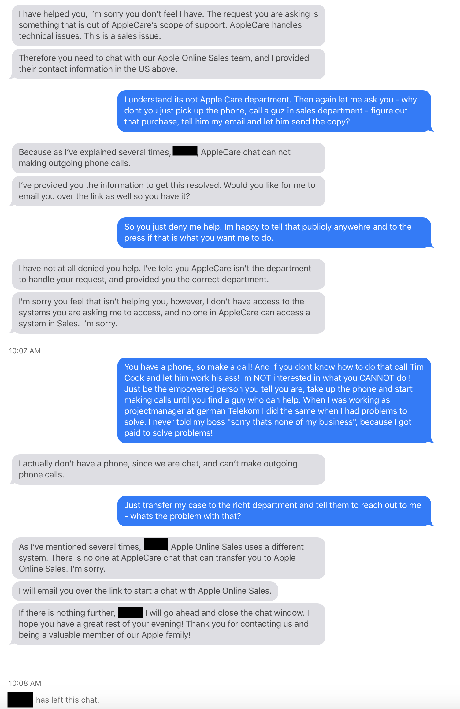 "Actually, it’s not AppleCare’s department to handle sales issues, Goetz. That’s what we have our Apple Online Sales team for, and I've given you the contact information for them in the US, and their chat support is open."