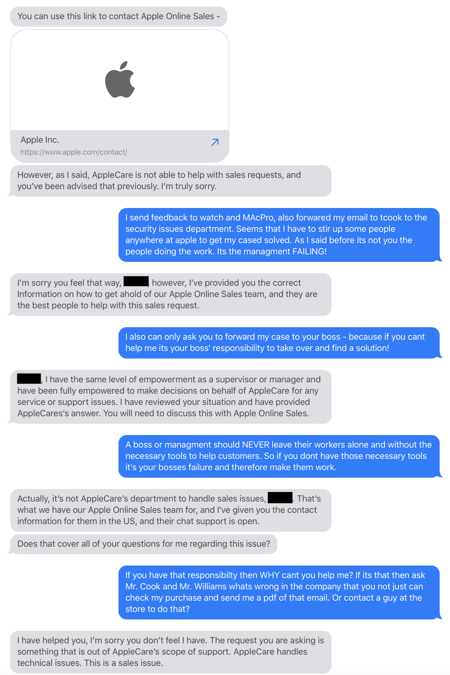 "However, as I said, AppleCare is not able to help with sales requests, and you’ve been advised that previously. I’m truly sorry."