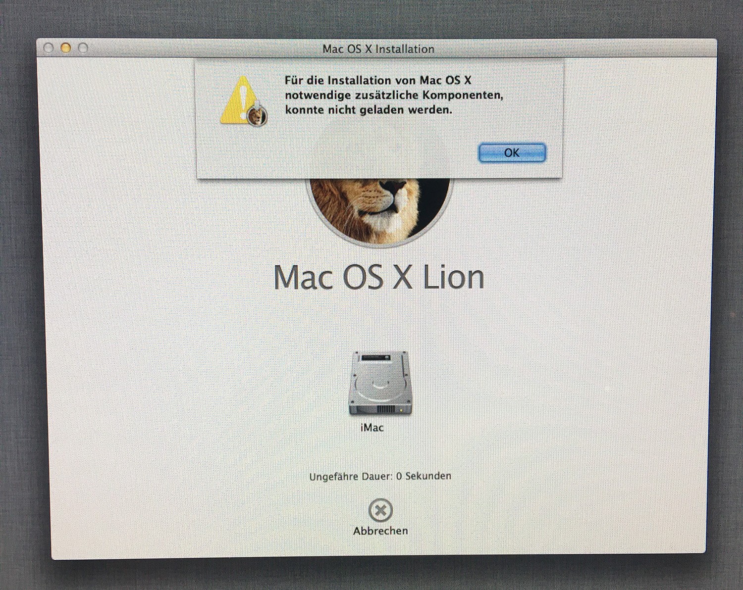 Bei der Durchführung einer neuen OS X Installation bekomme ich immer eine Fehlermeldung" Für die Installation von Mac OS X notwendige zusätzliche Komponenten, konnte nicht geladen werden."