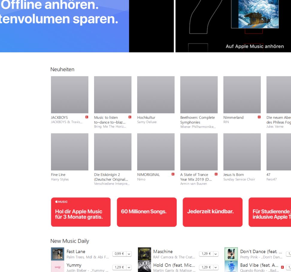 Habe heute auf einem neuen PC iTunes unter Win 10 64Bit installiert und sehe im iTunes Store einen Mix aus sichtbaren Covern und grauen Kästchen, wobei die grauen Kästchen unter den Rubriken "Neuheiten", "Vorbestellungen" und "Alben zu günstigen Preisen", "kürzlich erschienen", usw. auftauchen.