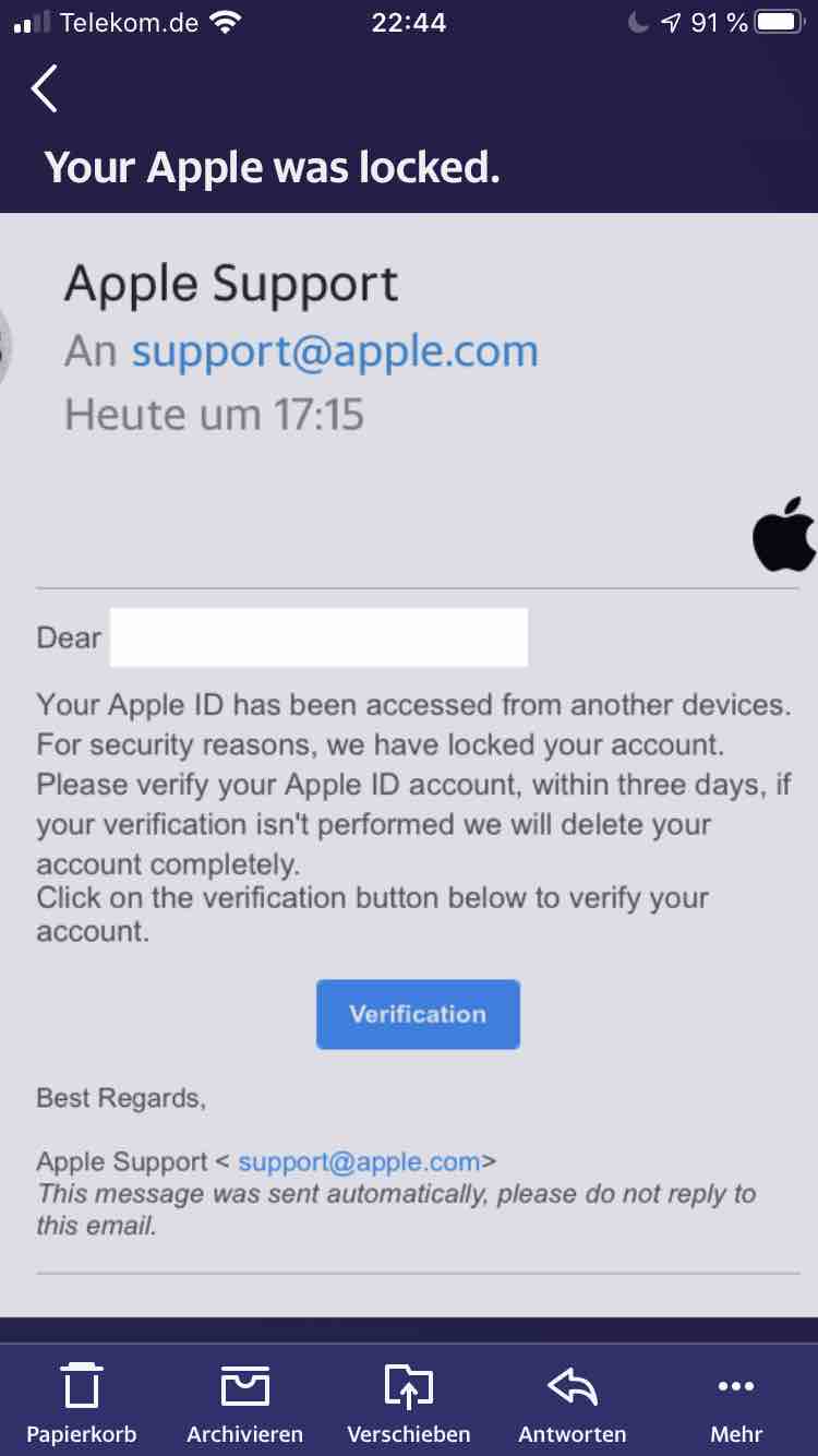 Weitere Infos findest du hier: https://support.apple.com/de-de/HT204759 da kannst du auch gleich die Mail zur Prüfung weiterleiten. Wenn du mal länger auf den Link drückst (bitte auf keinen Fall öffnen) wird dir normalerweise die URL angezeigt. Diese könnte dir auch noch weitere wichtige Details liefern!