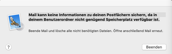 "Mail kann keine Informationen zu deinen Postfächern sichern, da in deinem Benutzerordner nicht genügend Speicherplatz verfügbar ist".