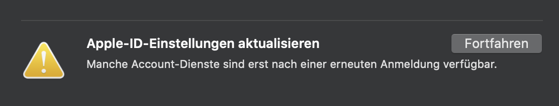 Seit dem Update auf Catalina werde ich ständig aufgefordert meine Apple-ID-Einstellungen zu aktualisieren. Es scheint daran zu liegen, dass ich zwei Benutzer auf dem gleichen Mac habe (Arbeit und Privat), die die gleiche Apple-ID nutzen.