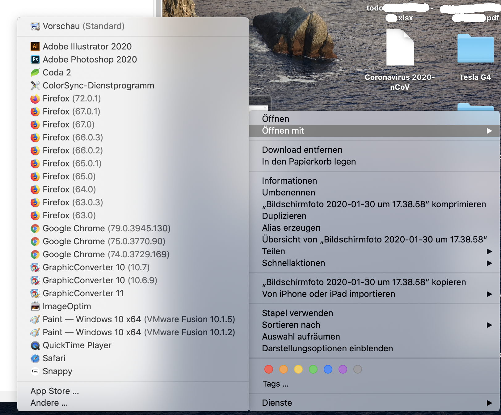 1.) Bei einem Klick auf eine Datei mit der rechten Maustaste wird ein Menü angezeigt in dem man den Befehl "Öffnen mit ..." auswählen kann. Dort werden dann alle Applikationen angezeigt, mit denen man die Datei öffnen kann. Seit der Mac OS X Version Catalina, werden alle möglichen Versionen der Applikationen angezeigt. Also auch ältere Versionen der Applikation (siehe Screenshot). Das Problem ist, dass diese Applikationen meist nur noch auf dem TimeMachine Backup gespeichert sind. Wählt man solch eine Applikation aus, wird angezeigt, dass die App nicht geöffnet werden kann, da sie auf einem TimeMachine Backup liegt. Das ist schon mal nervig. Es wäre sicher sinnvoll, wenn dort nur Applikationen angezeigt werden, die man auch verwenden kann. Die also auf dem aktuellen Volumen liegen. Hat irgend jemand eine Idee wie man das erreichen kann?