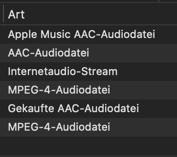 Warum wird aber beim Rest, die alle vor Hochladen der Mediathek zu Apple Music als lokale Dateien vorhanden waren, unterschieden zwischen "Internetaudio Stream", "Gekaufte AAC-Audiodatei" und "AAC Audiodatei"?