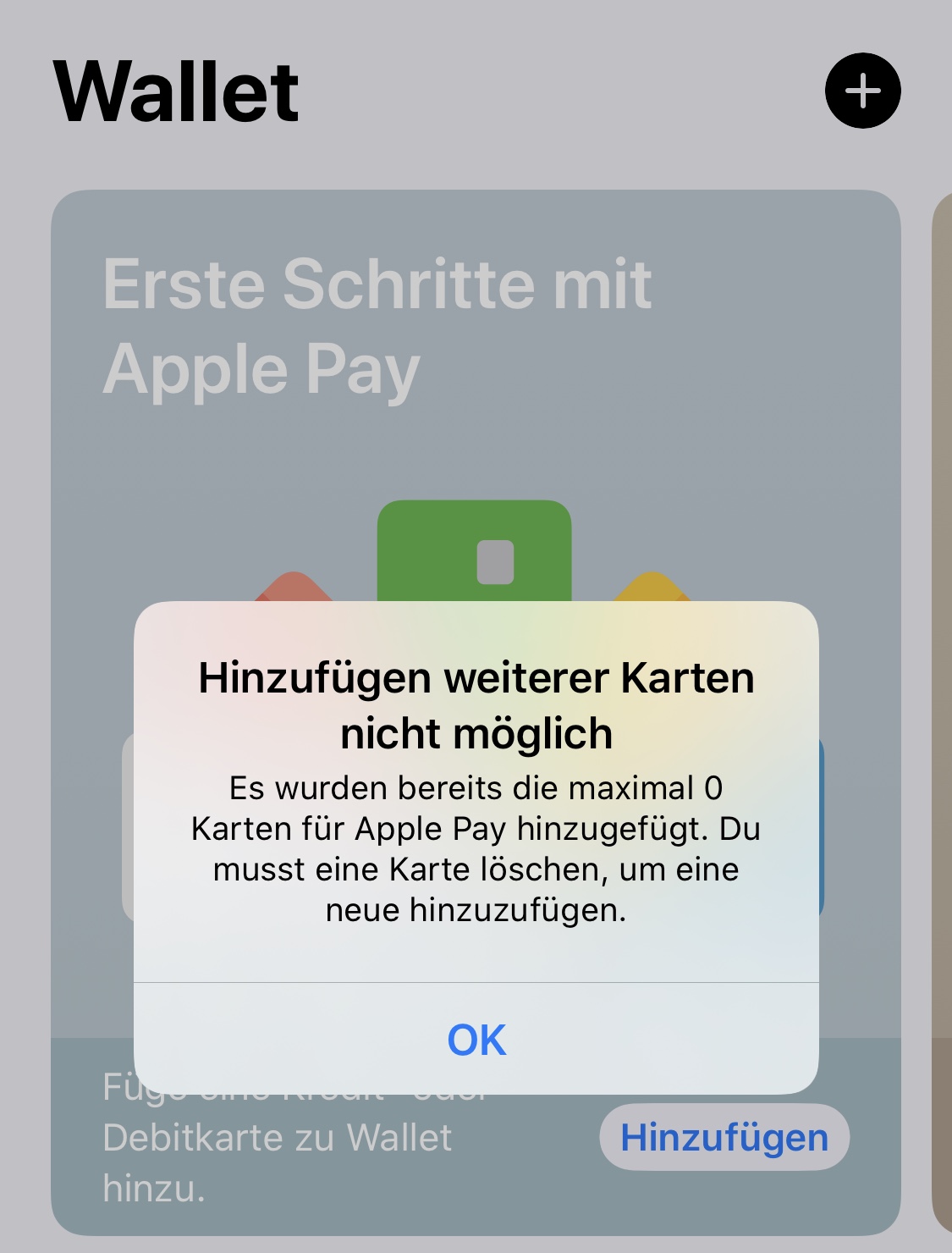 Hallo, ich wollte 1.mal Apple Pay benutzen. Dafür musste ich meine Bankkarte mit Apple Wallet konfigurieren. Doch das klappt leider nicht. Wenn ich auf „hinzufügen“ (oder auf +) klicke. Erscheint „Es wurden bereits die maximale 0 Karten hinzugefügt. Du musst eine Karte löschen, um eine neue hinzuzufügen.“