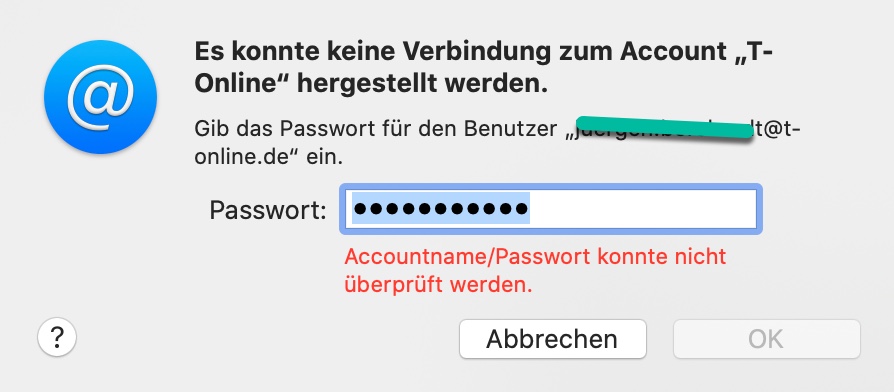 Seit heute Morgen (24.02.20, 10:00 Uhr) können mein iMac und MacBook Pro mit dem Apple Mailprogramm keine Verbindung mehr zu meinem T-Online-Postfach herstellen.