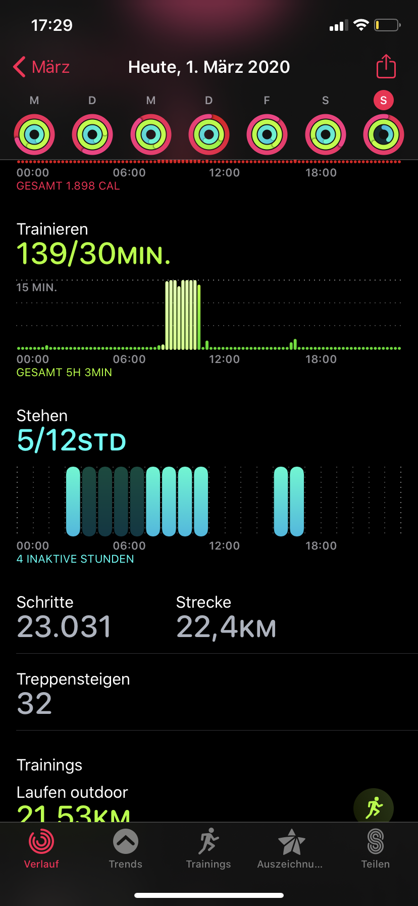 Die Stehstunden werden nicht richtig aufaddiert - meine Apple Watch und mein iPhone sagen, dass ich nur 5 Stunden gestanden bin aber auf der Aktivitätsapp zeigt es mir 7 Balken an (es wären also 7 Stehstunden).