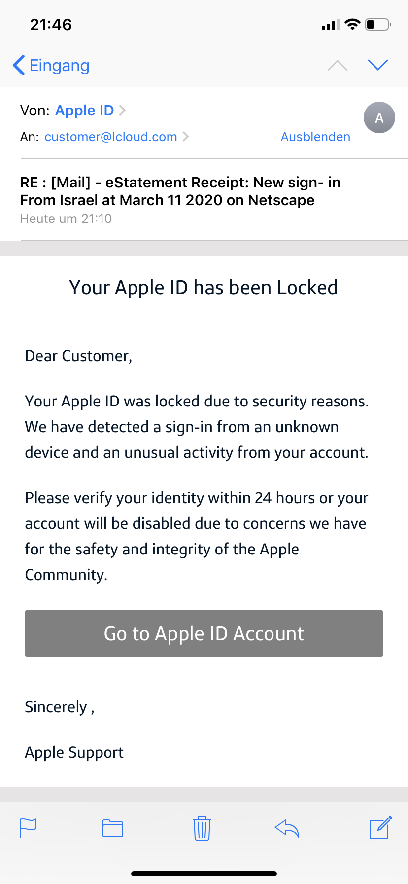 offenbar kursieren momentan wieder Fake Mails zu Apple Anmeldungen im Ausland