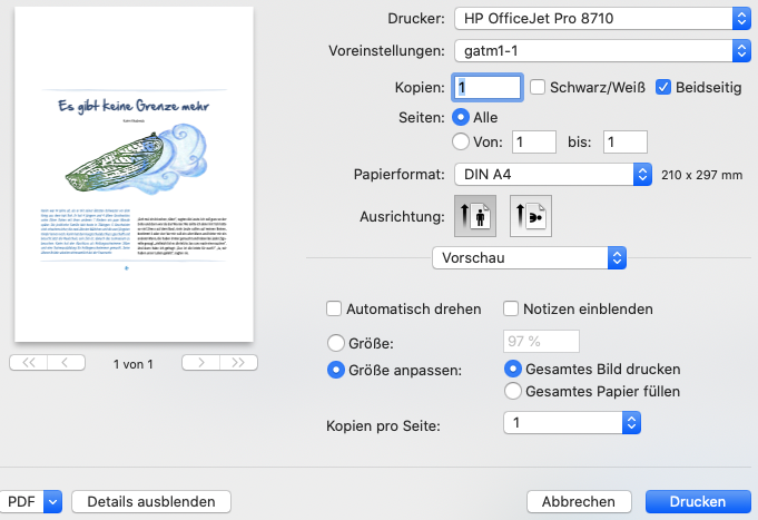 Ich habe von einer LayoutFirma ein pdf erhalten. In Vorschau wird es richtig dargestellt. Beim Ausdruck wird ein schwarzer Kasten im Bild gedruckt. Beim Drucken mit AcrobatReader tritt der Fehler nicht auf.