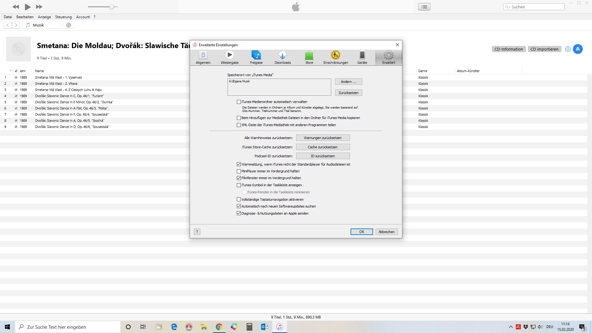 Bislang konnte ich meine CDs direkt in den von mir vorgegebenen Pfad ablegen, jede neu importierte CD wurde dort einsortiert, z.B. in den Ordner K:\Eigene Musik (Einstellungen Speicherort von itunes Media) . Nun hatte ich versucht, den Speicherort auf einer anderen Festplatte festzulegen, z.B. auf J:\Eigene Musik. Diese Zuordnung gelang dann mit einigem Aufwand, ich änderte den Speicherort in J:\Eigene Musik. Nun aber importierte itunes meine CDs nicht mehr direkt in J:\Eigene Musik, sondern legte automatisch einen Unterordner music als Ablageort an. Das konnte ich beim besten Willen nicht ausschalten, auch nach Abschaltung aller Automatiken bei Einstellungen. Ich bin dann mit der Mediathek auf den alten Speicherort zurückgekehrt, und dort ist es nun ebenso. Die neue CD wird in einen neuen Unterordner music kopiert. Wie lässt sich das verhindern? Anbei ein Screenshot meiner aktuellen Einstellungen. Ich nutze einen PC und Windows 10 mit allen aktuellen Updates. Danke