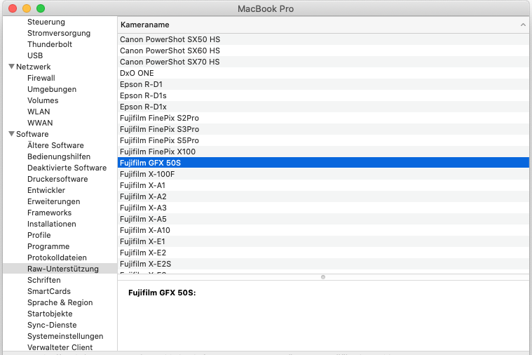 Wenn die Kamera in der RAW-Support Liste im Systemprofil auftaucht, ist sie unterstützt.