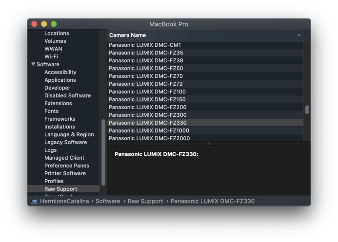 Der RAW Support wird auch auf meinem Catalina MacBook Pro genauso angezeigt wie in deinem Bildschirmfoto, für alle Kameramodells. Es wird nur das Kameramodell aufgelistet und mehr nicht. Aber ich kann den RAW Support in Fotos benutzen. Er ist installiert für alle Kameramodelle, die im Systemprofil aufgelistet werden. Hier ist Bildschirmfoto vom macBook Pro mit Catalina: