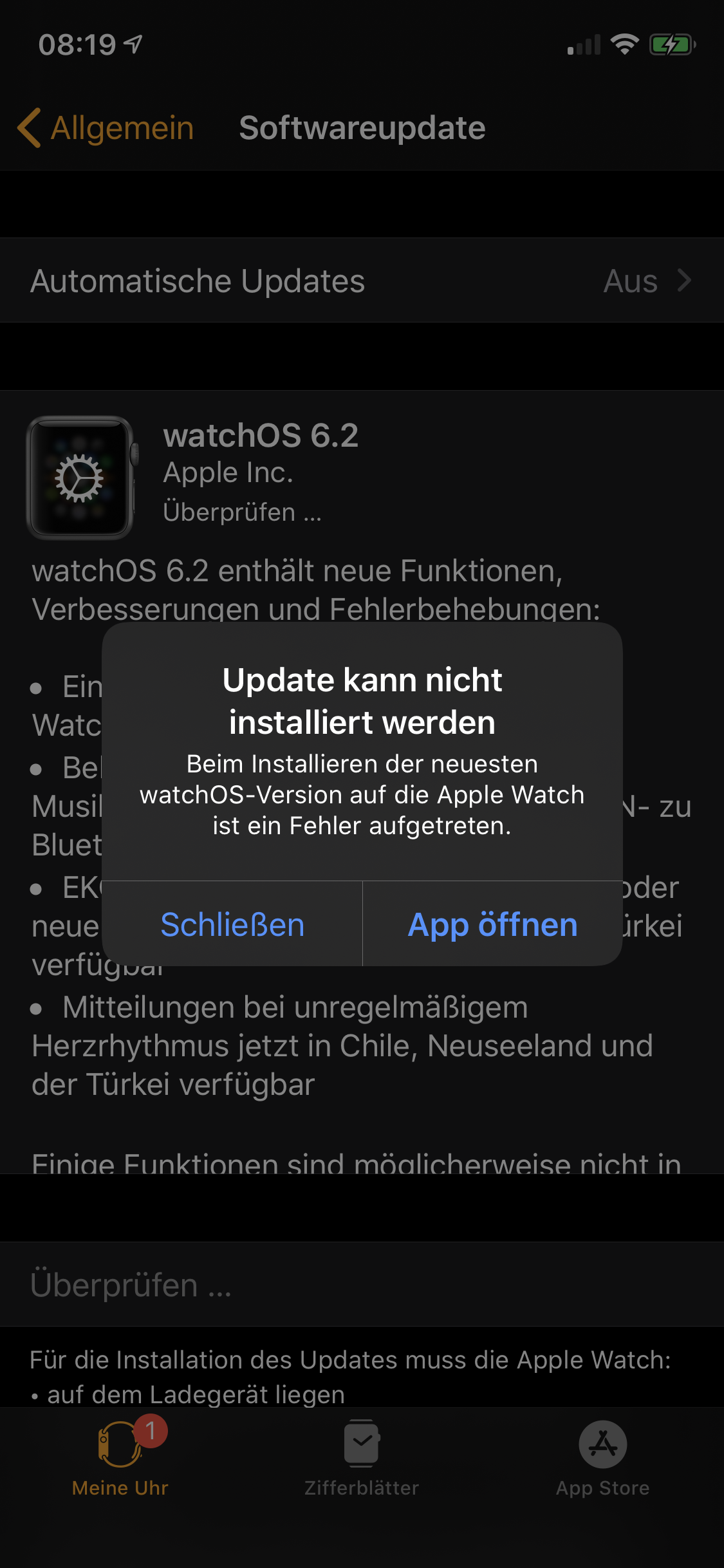 Bei mir klappt die Installation von watchOS 6.2 nicht. Es kommt jedesmal die Meldung "Update kann nicht installiert werden" (siehe Screenshot).