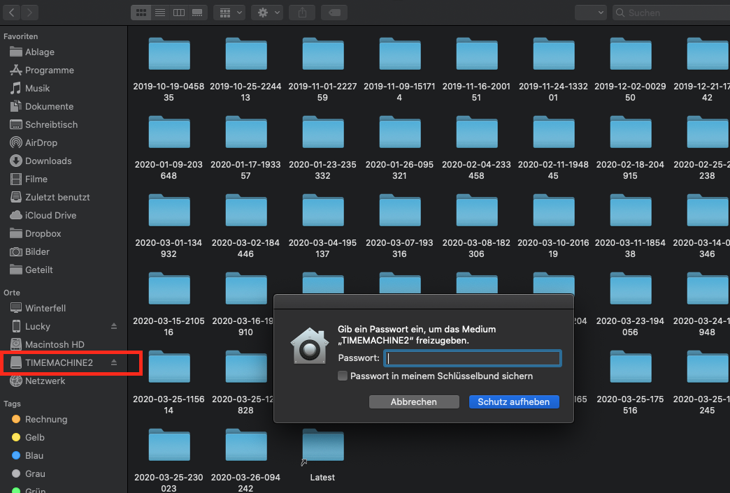 Ich habe per USB dauerhaft eine Festplatte an meinem iMac angeschlossen die ich für Timemachine nutzen. Die Festplatte ist verschlüsselt. Bei jedem Neustart bekomme ich das Pop-up "Gib ein Passwort ein, um das Medium "TIMEMACHINE2" freizugeben angezeigt. Die Festplatte ist aber schon längst entschlüsselt und auch das Timemachine Backup funktioniert einwandfrei. Ich kann also im Pop-up einfach auf "Abbrechen" klicken.
