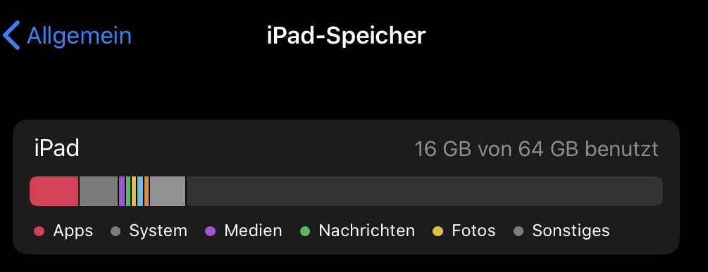 bei der Speicherverwaltung meines iPad´s ist mir aufgefallen, dass der "Dateimanager" (Auf meinem iPad) einen freien Speicherplatz von 33,75GB angibt. Ein Blick in die Einstellungen -> Allgemein -> iPad-Speicher gibt 16GB von 64GB(mir ist klar, dass bei 64GB nie 64GB verfügbar sind) benutzt => 48GB frei.