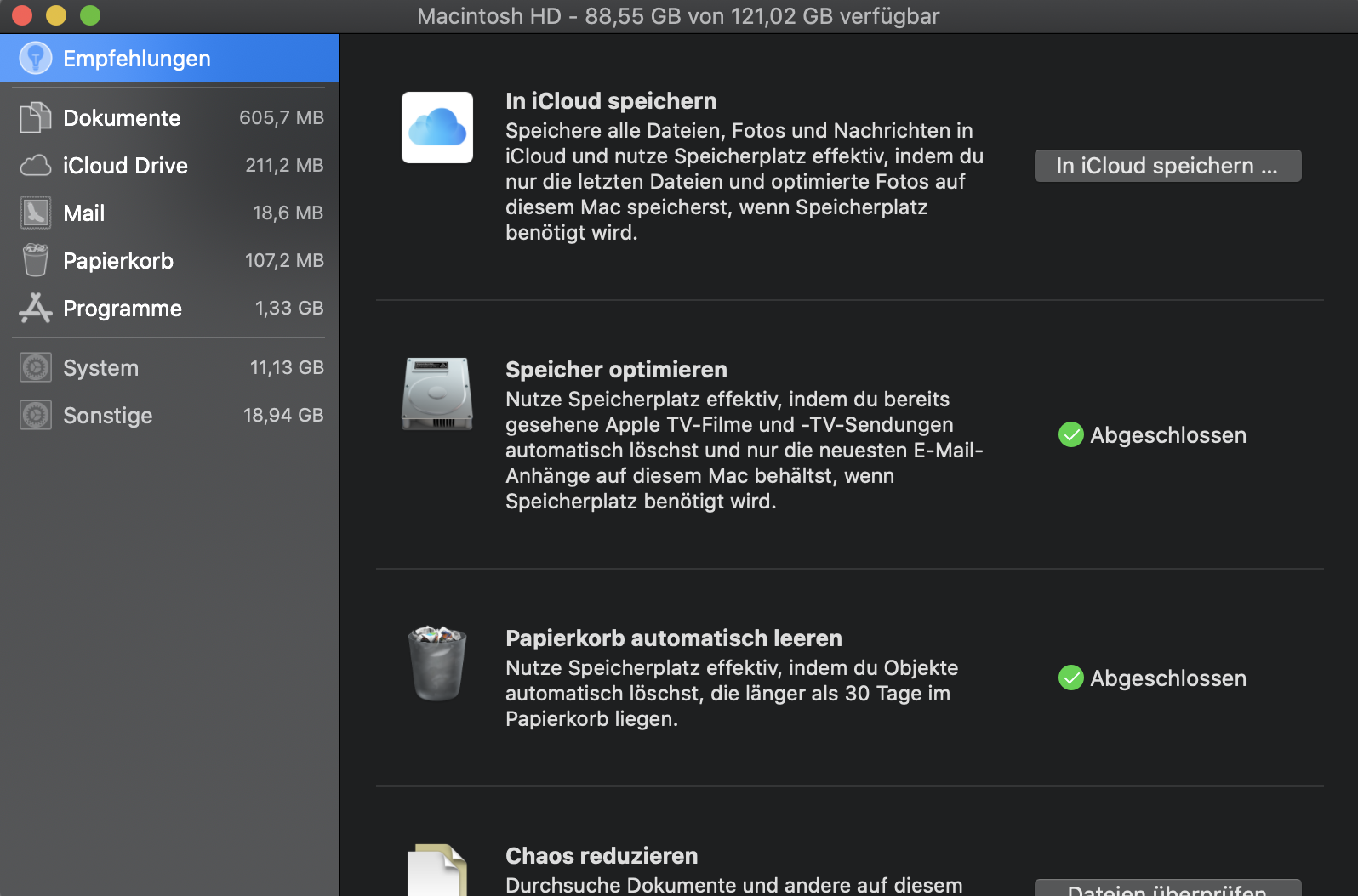 Also, als ich meinen MacBook zurückgesetzt habe, haben die "Sonstigen" Daten 10GB eingenommen, was ja in Ordnung ist. Ca. 6 Tage nach dem Zurücksetzen, schaue ich nach wieviele die "Sonstigen" Daten einnehmen, und ich sehe da 18GB. Ich habe auch schon alle Empfehlungen angemacht, die haben auch geholfen. Ich habe keine Fotos oder Musik auf meinem MacBook. Nur einpaar Apps, wie zum Beispiel: Skype, Pages, Malwarebytes, Visual Studio Code, Spotify, Discord, die aber nur 1,33GB einnehmen. Aber die "Sonstigen" Daten werden immer größer. Ich habe auch schon Apps heruntergeladen die diese Daten löschen, aber für die meisten muss ich zahlen und das will ich ehrlich gesagt nicht tun.
