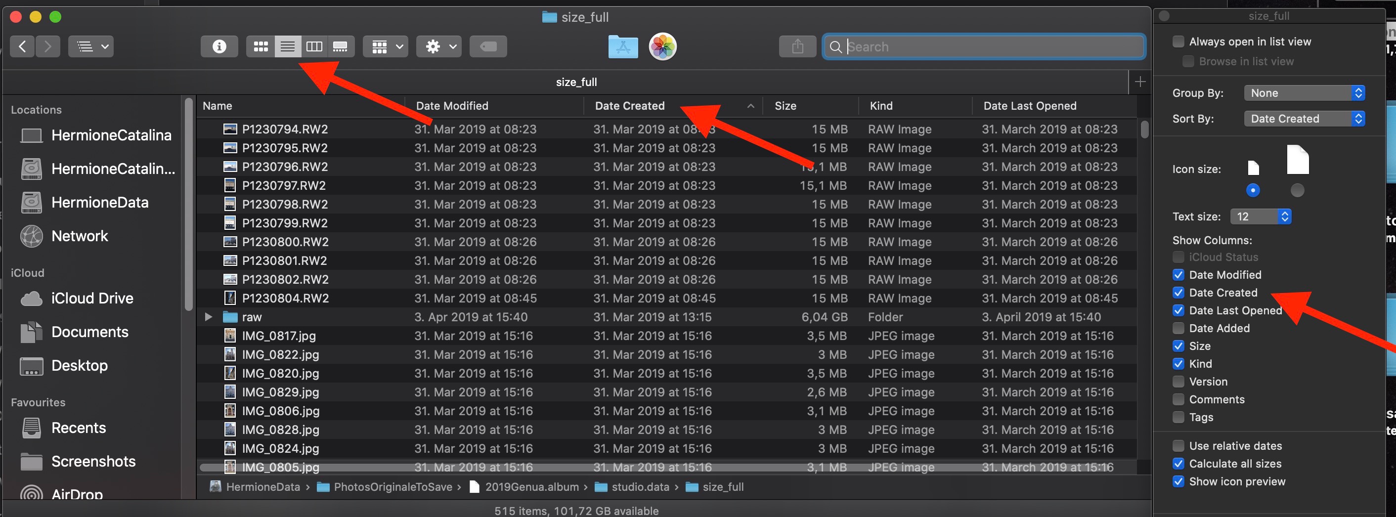 Um nach dem Aufnahmedatum (Inhalt Erstellt) zu sortieren, verwende ich Programme von Drittanbietern, die das Aufnahmedatum in das Erstellungsdatum der Datei kopieren. Ich finde Raw Right Away am einfachsten, aber GraphicConverter installiert ebenfalls einen Dienst der das kann: Ich muss das exportierte Foto nur rechts-klicken oder Ctrl-klicken, und dann auf "Dienste" klicken. Dann wähle ich "Apply Camera Timestamp" oder den Dienst von Graphic Converter und das Erstellungsdatum wird auf das Aufnahmedatum (Inhalt erstellt) zurückgesetzt.