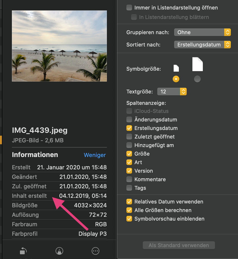 Hier ist noch ein Beispiel: Das Bild habe ich am 2. Dezember aufgenommen, und das zeigt der Finder korrekt unter "Inhalt erstellt" an. Die Datei wurde gerade jetzt exportiert, und das Erstellungsdatum der Datei ist daher "Heute". Alle Daten sind korrekt da und im Finder zu sehen, nur können wir leider nicht nach "Inhalt Erstellt" im Finder sortieren.