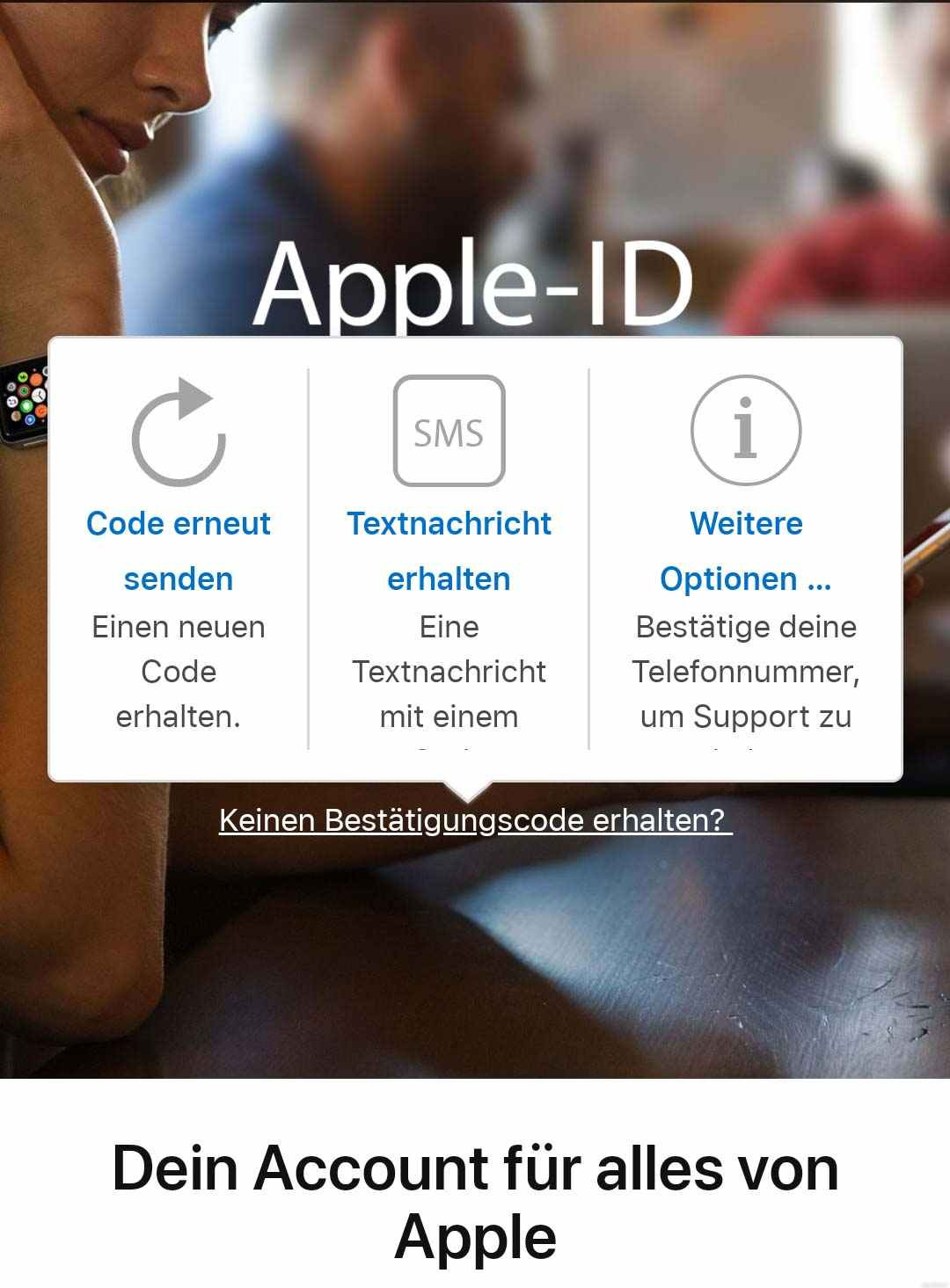 Wenn du kein vertrauenswürdiges Gerät zur Hand hast, kannst du den Bestätigungscode als SMS oder telefonisch an eine vertrauenswürdige Rufnummer übermitteln lassen.