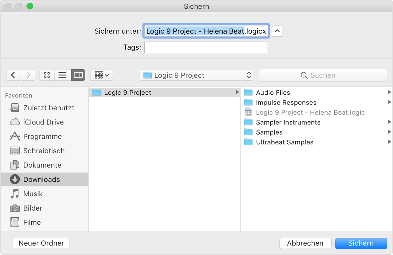 Suche nach der älteren Projektdatei, klicke auf sie, und klicke anschließend in der angezeigten Warnmeldung auf "OK". Wähle im daraufhin angezeigten Dialogfenster "Sichern unter" einen Namen und einen Speicherort für das neue Projekt. Wenn die Option "Erweiterte Werkzeuge einblenden" auf deinem Gerät aktiviert ist, kannst du das Projekt als Paket oder als Ordner sichern und außerdem die Dateien auswählen, die in das Projekt kopiert werden sollen. Wenn die Option "Erweiterte Werkzeuge einblenden" deaktiviert ist, sichert Logic Pro X dein Projekt automatisch als Paket. Je nach deiner Arbeitsweise bietet sich die eine oder andere Methode an, um das Projekt zu sichern; beide haben individuelle Vorteile.