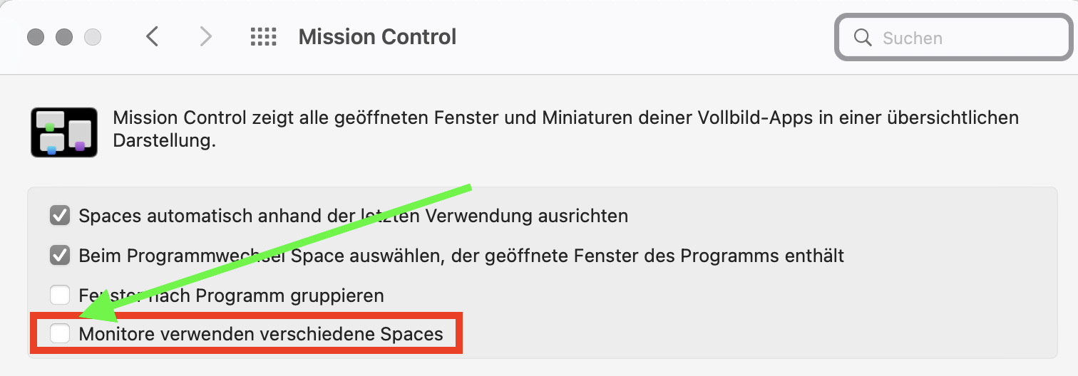 1. Unter Systemeinstellungen "Misson Control" Häckchen bei "Monitore verwenden verschiedenen Spaces" entfernt