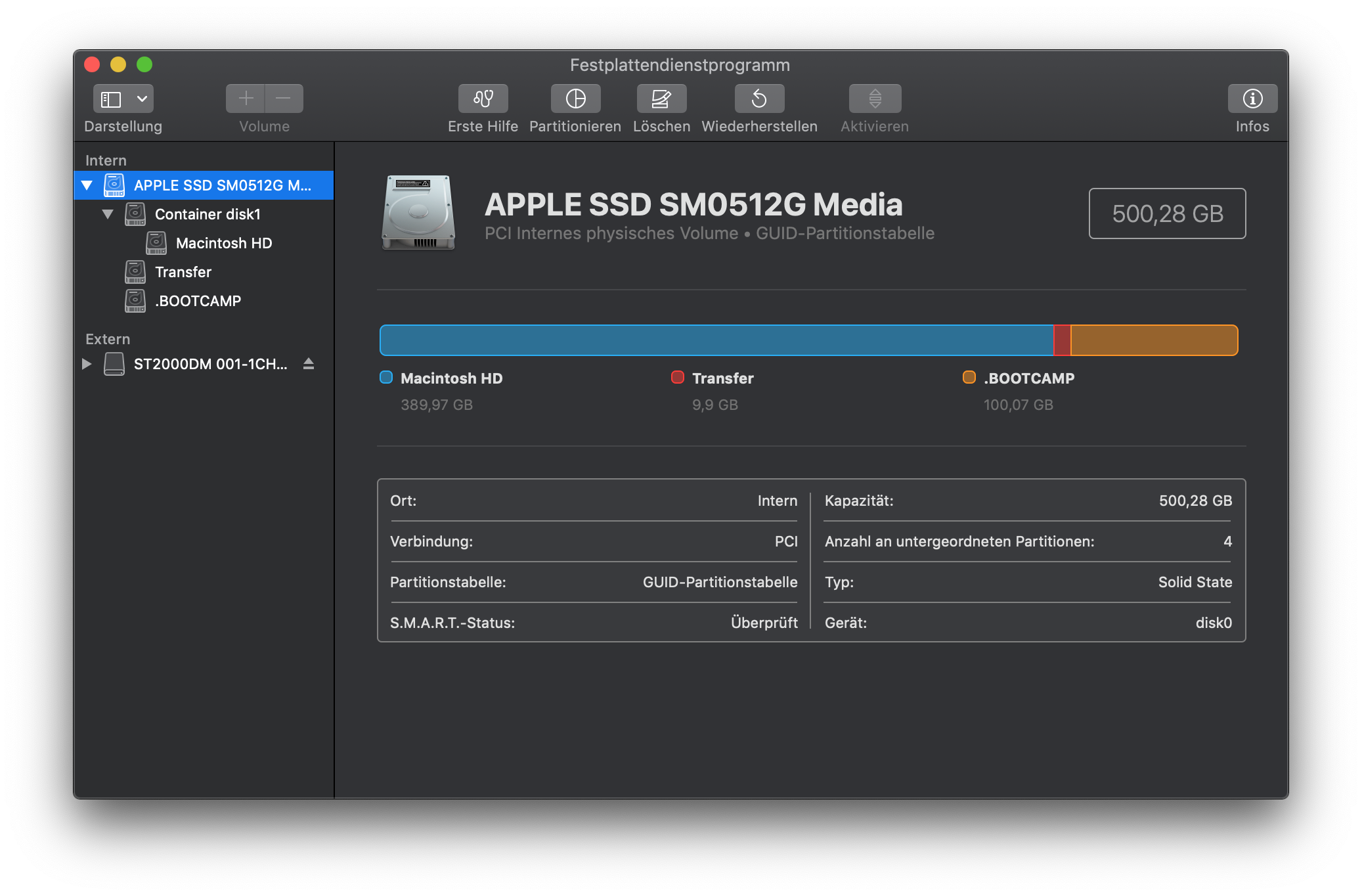 Ich möchte auf meinem MacBook Pro (macOS Mojave) gerne eine zusätzliche Partition im ExFAT-Format zur Installation eines alternativen Betriebssystems formatieren. Laut Festplatten-Dienstprogramm habe ich auf meinem Startvolumen Macintosh HD noch über 100GB freien Speicherplatz (siehe Bild 1), die neue Partition soll 50GB groß werden, das sollte also passen.
