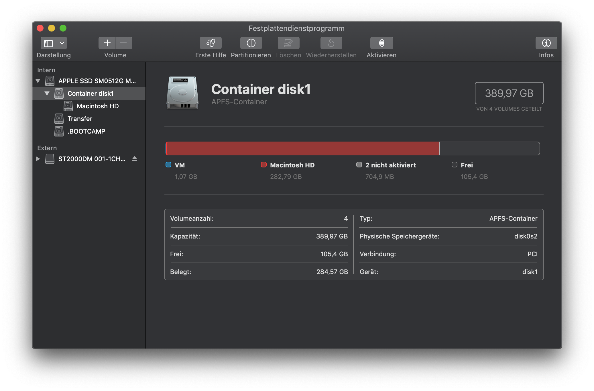 Warum benötigt der APFS-Container 380GB, obwohl nur 280GB belegt sind? Kann ich das umgehen ohne die gesamte Platte zu löschen?