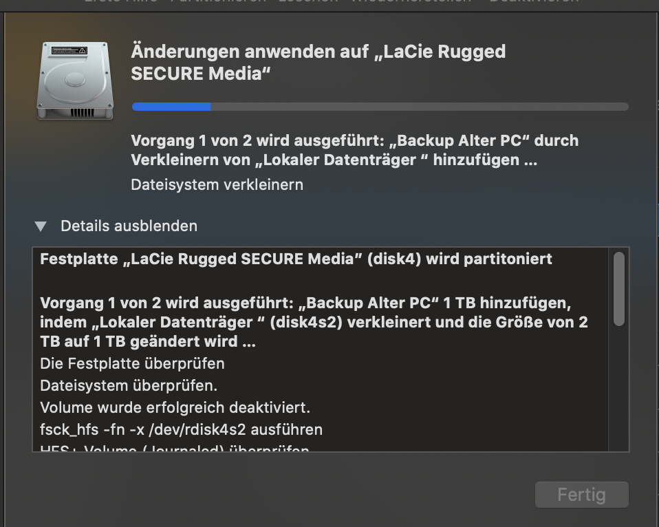 Ich wollte gerade bei einer externen Festplatte von Lacie im Festplattendiesntprogramm eine zweite Partition hinzufügen. Jedoch hat sich der Vorgang nach kurzem Laden aufgehangen und lädt jetzt seiner über einer Stunde nicht mehr.