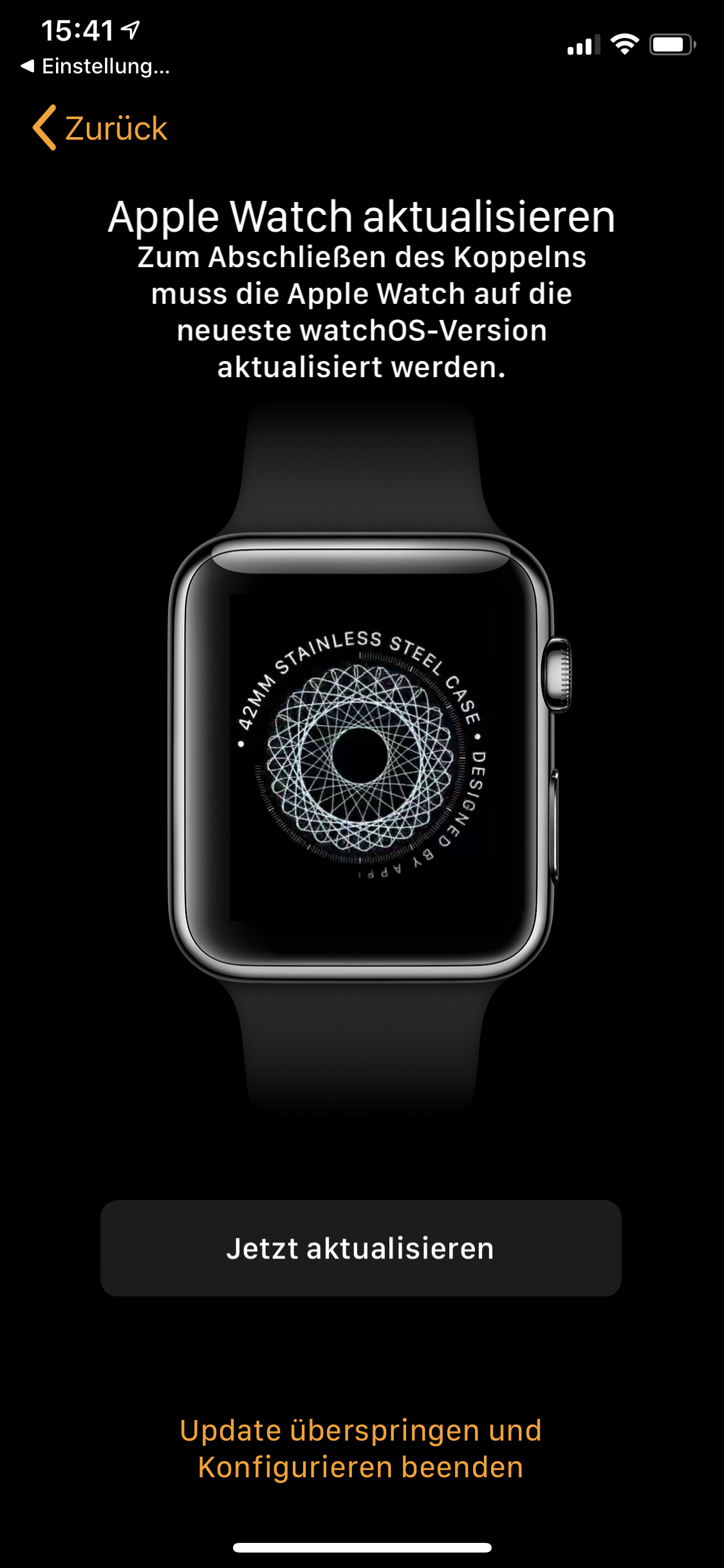 ich habe eine alte Apple Watch (Ich glaube 1) bekommen und möchte diese mit meinem iPhone koppeln. Leider scheitert dies bei der Einrichtung. Ich erhalte die Meldung, dass die Apple Watch erst aktualisiert werden muss, dann lande ich im Softwareupdate, welches sagt: "WatchOS 1.0.1 Deine Software ist auf dem neuesten Stand." Die einzige Option von hieraus ist Abbrechen, was dann zum Abbruch des Pairings führt. Ich verwende aktuell iOS 13.3.1.