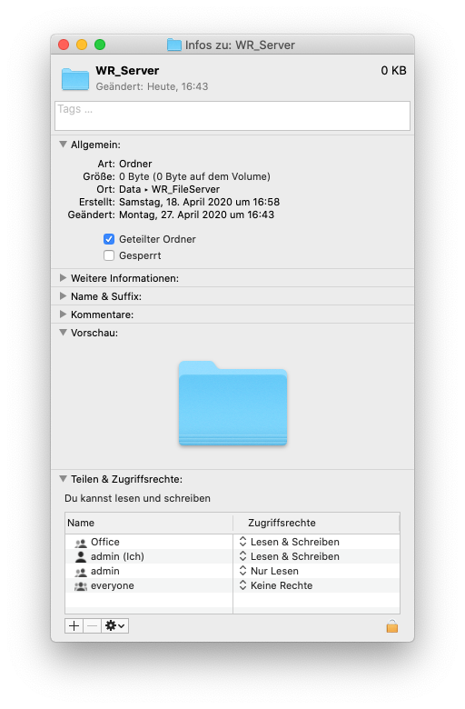 Ich habe einen Mac mini Server und wie früher mit AFP eine SMB Freigabe eingerichtet. Ich habe eine Gruppe erstellt mit dem Namen WR_Office (ca. 10 Benutzer), wenn nun ein Benutzer dieser Gruppe eine Datei auf den Server kopiert, übernimmt dieser die Gruppenrechte nicht. Eigentümer ist jeweils der, welcher die Datei hochgeladen hat und nicht die Gruppe derer er angehört. Und die anderen Benutzer können die Datei nicht öffnen oder löschen oder was auch immer. "Sie haben nicht die benötigten Zugriffsrechte". Hat jemand einen Lösungsansatz? Anbei ein Screenshot mit den Zugriffsrechten wie sie auf dem Server gesetzt sind. Mit dem genau gleichen Setup hat das vorher mit AFP bestens funktioniert. Jetzt mit Catalina und AFPS / SMB leider nicht mehr. Besten Dank für eure Hilfe, Steve.