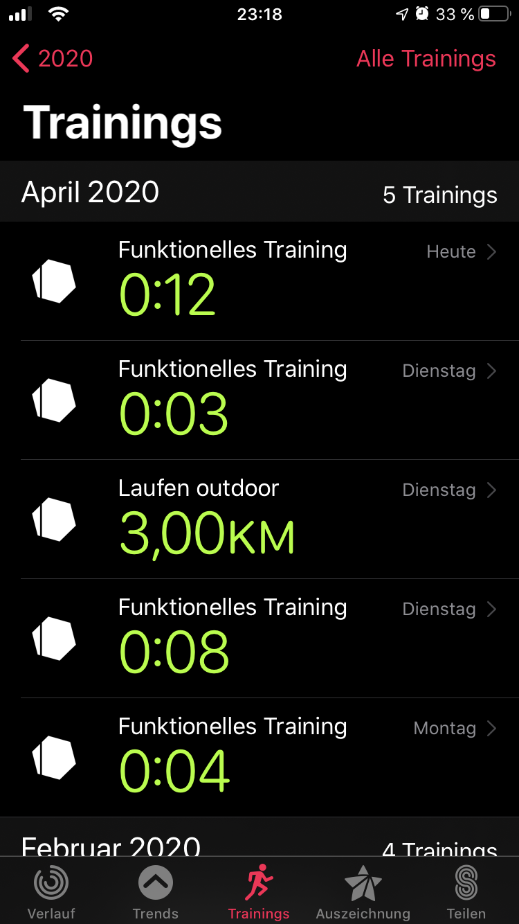 Soweit ich das erkennen konnte, lief keine Trainingsaufzeichnung im Hintergrund. In der App Aktivität ist auch kein Training hinterlegt.
