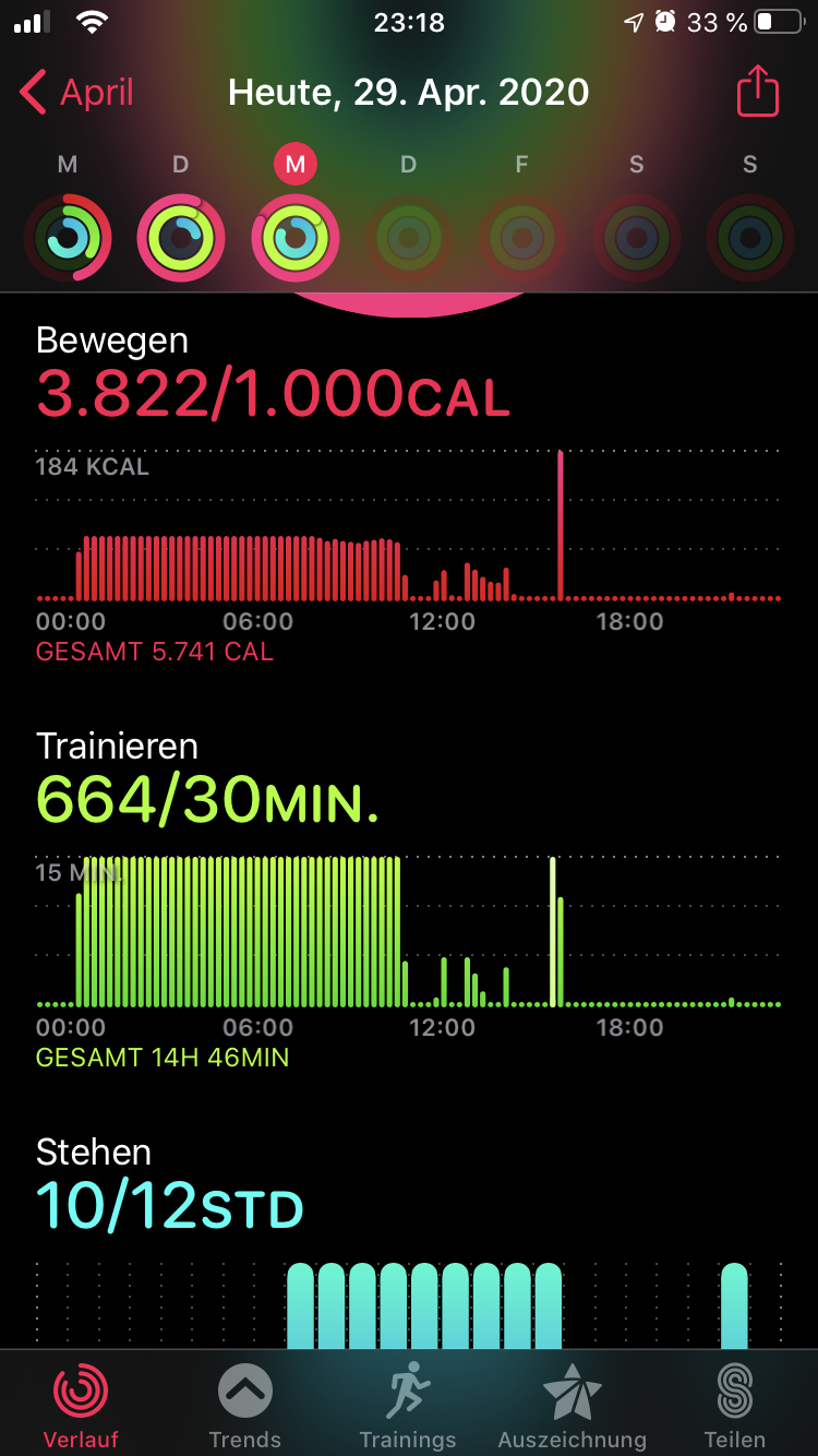 meine Watch hat heute ein Training aufgezeichnet, obwohl ich überhaupt nicht trainiert habe. Ich saß stattdessen am Schreibtisch und mittlerweile steht der rote Kreis (Aktivitätskalorien) auf 3.822 und der grüne Kreis (Training) auf 664. Zudem habe ich heute im sitzen sämtliche Auszeichnungen abgeräumt.