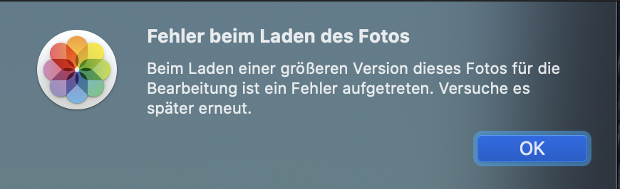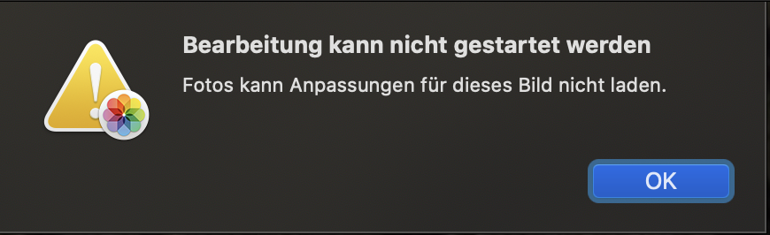 Hallo, da es ja wohl nicht so sehr besucht ist hier in diesem Forum, hier noch etwas was ich herausfinden konnte. Es scheint etwas mit der "bearbeitbarkeit" von einzelnen Fotos zu tun zu haben. Ich hatte zunächst den verdacht, dass es etwas mit der Gesamtgröße der ausgewählten Fotos zu tun hat. Dem war jedoch nicht so. In einem meiner Alben hatte ich die Anzahl auf zwei Fotos reduziert. Eines der Fotos war als "HDR" gekennzeichnet. Dies stellte sich aber auch nicht als Grund heraus. Ein Foto war jedoch ausschlaggebend. Dies konnte auch nicht bearbeitet werden in "Fotos". Wenn man das Foto bearbeiten will wird das seitliche Menü nicht angezeigt und es erscheint eine Fehlermeldung (siehe unten). Vielleicht hat ja jemand eine Ahnung woran das liegen könnte. Ich habe so die Vermutung dass die App "CleanMyMac" hier reingefunkt hat. Nur eine Vermutung.
