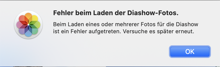 Ich habe Catalina als update installiert und es ist auf aktuellem Stand. Meine Fotomediathek habe ich schon mit den hier erwähnten Methoden reparieren lassen. Ich benutze kein Cloud da sie für meine Fotomediathek zu klein ist. Ich habe meine Fotos nach Themen in "Meine Alben" sortiert und zusammengestellt. Wenn ich jetzt, egal mit welcher Vorgehensweise, eine Diashow starten möchte kommen folgende Fehlermeldungen: