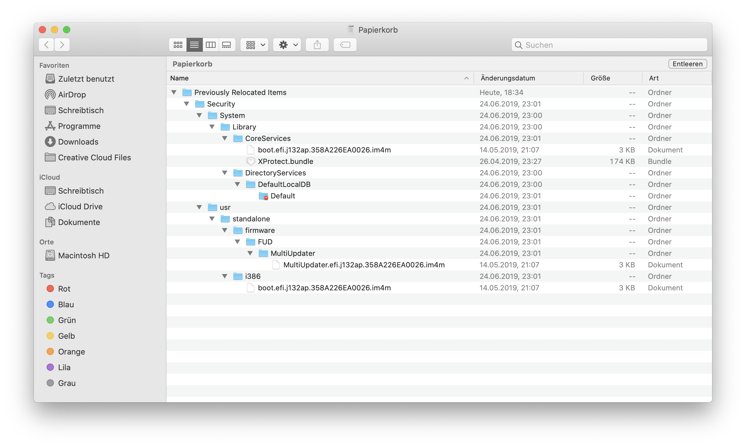 - Beim ersten Problem geht es um den Ordner "Previously Relocated Items", den ich in meinem Nutzerverzeichnis gefunden habe - und in den Papierkorb gesteckt habe. Von dort aus kann ich diesen leider nicht mehr löschen und das Leeren meines Papierkorbs wird mir nun mit einer Fehlermeldung "wird von macOS benötigt" quittiert. Habe schon probiert an den Rechten der Dateien Änderungen vorzunehmen, verzeichnete jedoch bislang ohne Erfolg.