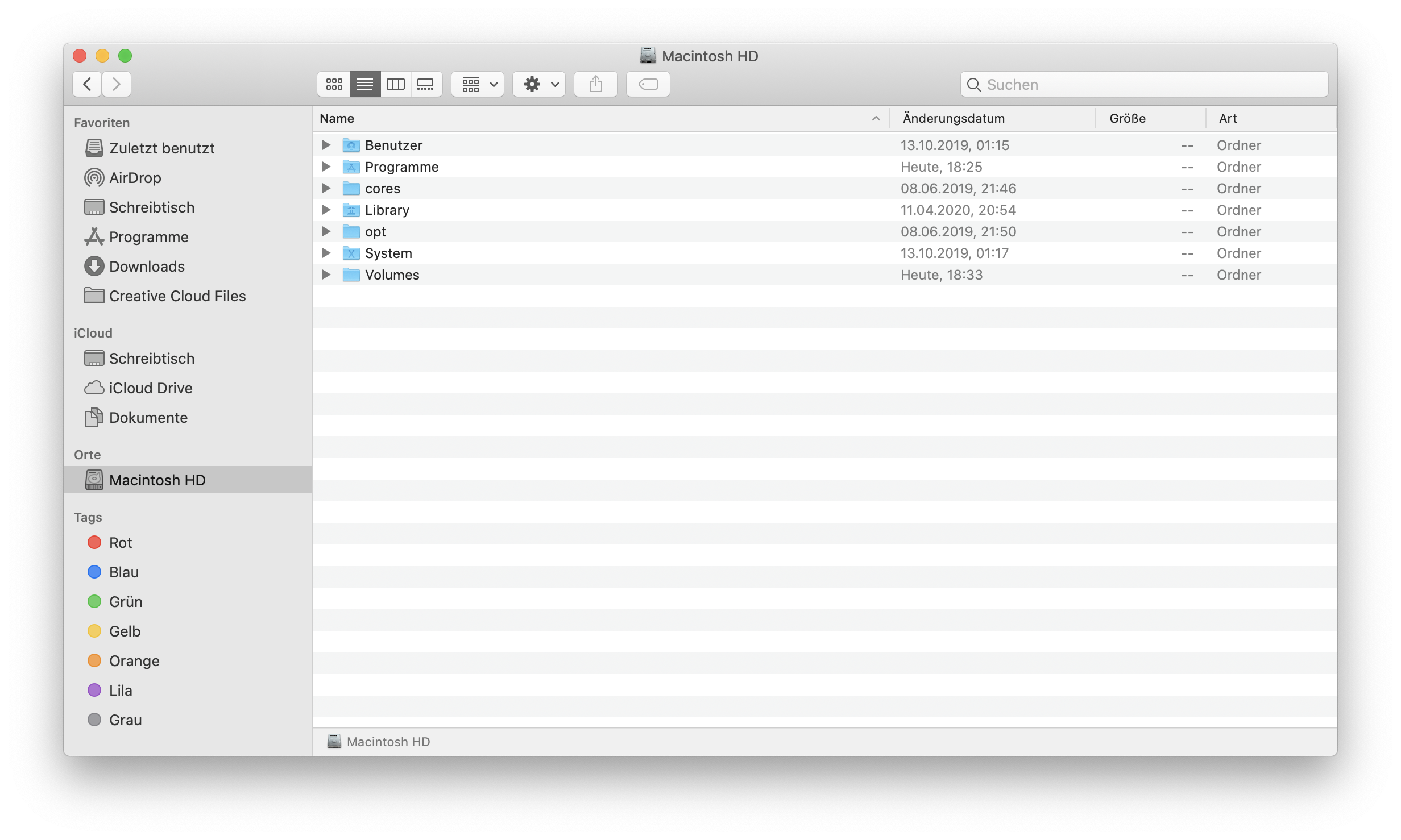 - Auf der Macintosh HD-Partition sehe ich ebenfalls seit dem Upgrade auf macOS Catalina die Ordner "opt", "cores" und "Volumes". Der "Volumes"-Ordner erklärt sich mir durch die Trennung der Nutzerdaten von den Systemdaten. "opt" und "cores" sollten jedoch vermutlich nicht in dieser Liste erscheinen.