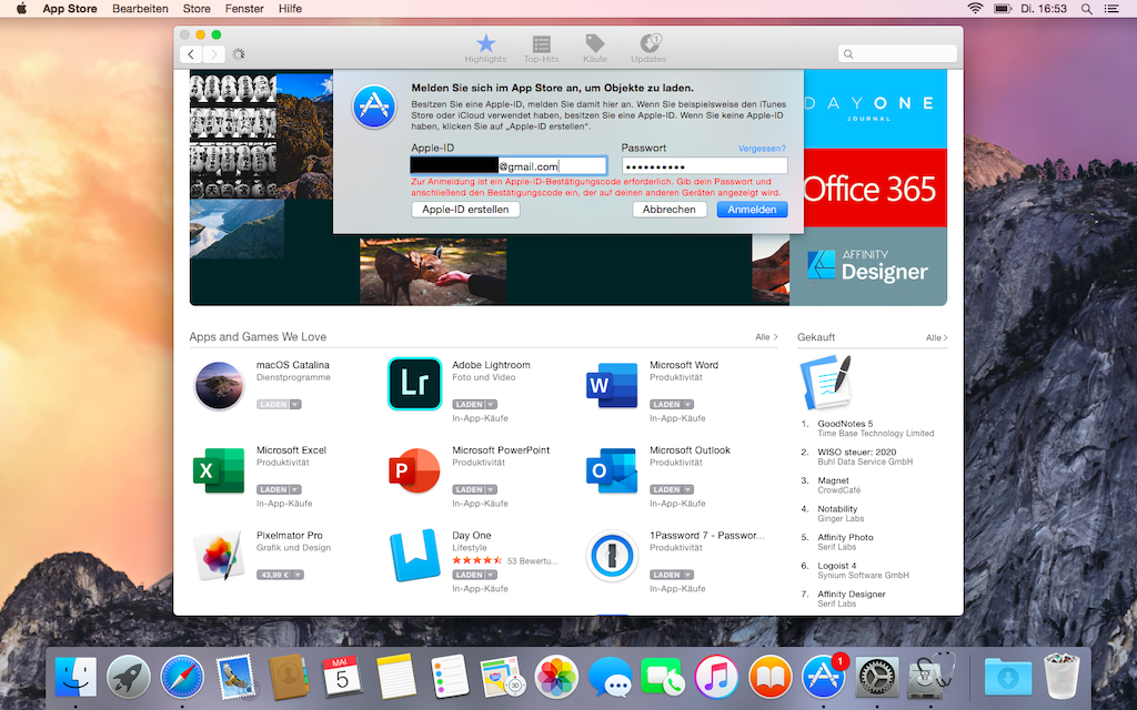 Es folgt eine Aufforderung, sich per Apple-ID anzumelden. Nutzername und Passwort eingeben, bestätigen, dann erscheint der rote Hinweis wie im Screenshot.