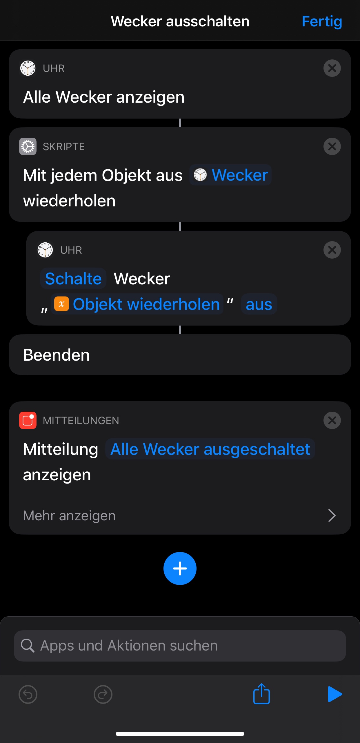 Hallo und danke - ich glaube gerne dass das interessant ist, habe aber aktuell nicht die Zeit und Lust mich da reinzuarbeiten. Wenn ich einen Weckerkurzbefehl erstelle, taucht „Wecker“ auf - den kann ich dann durch einen konkreten Wecker (aber nicht „alle“) ersetzen. Gür einen kurzen Tipp wie ich genau dieses Thema ganz konkret löse wäre ich dankbar