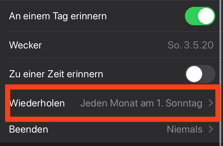 Ich lasse mich nächsten Sonntag erinnern (am 10.06.2020) und stelle die Wiederholung auf wöchentlich.
