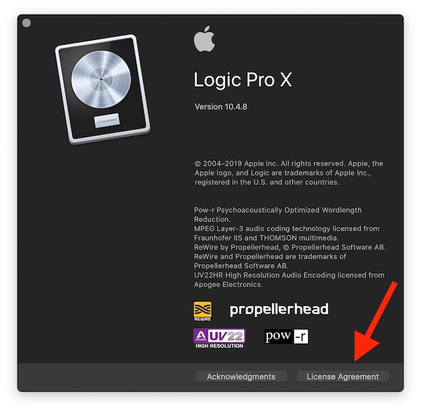 Nachtrag: Wenn du für irgendein Programm, das du aus dem AppStore gekauft hast, auf das Hauptmenü gehst und auf den Namen des Programm gehst, kannst du die Lizenz öffnen. Beispielsweise sehe ich in Logic Pro X unter "Logic Pro X > Über Logic Pro X" diesen Dialog: