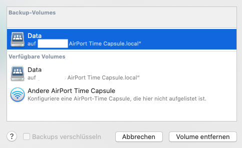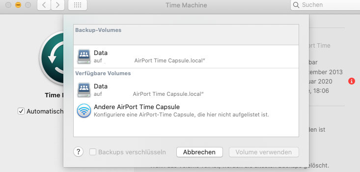 nach längerer Zeit habe ich meinen iMac wieder zu mir in den Haushalt geholt und wollte auch wieder regelmäßig Backups erstellen auf meiner TimeCapsule ablegen lassen. Der iMac war schon früher mal, allerdings in einem anderen WLan-Netzwerk (anderer Haushalt), mit der TimeCapsule verbunden und hatte seine Dienste früher immer zuverlässig verrichtet.